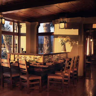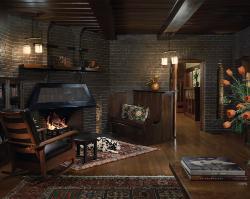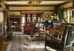 Other notable areas in the house include a library with a fireplace and a built-in inglenook. The living room overlooks the expanse of the Arroyo Seco and Colorado Bridge and features a large fireplace, cabinets and decorative framing constructed of rare Honduras mahogany. The light fixtures, andirons and , drop-front desk desk and sofa are replicas of the original Greene and Greene circa 1906 furniture. The living room leads into a solarium with intricate mahogany carved panels depicting the sunrise, moon, stars and sunset and seagulls oriented in the corresponding cardinal directions of the room. Architect Charles Greene carved these panels during his "celestial period" while living in Carmel, California. A new large porch with French doors allow guests to step outside to the new south fountain depicting a life sized, hand carved ceramic tile tree.