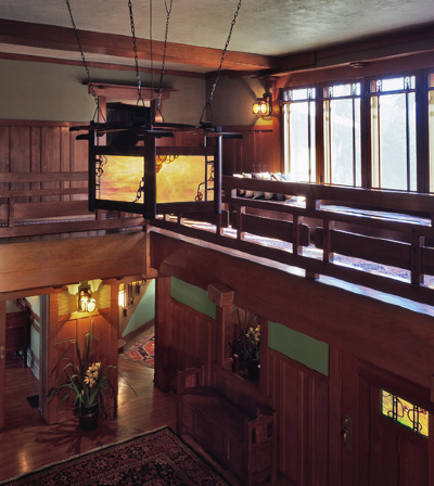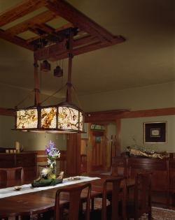 The 1992, Whittier Narrows earthquake damaged the house substantially. The original plaster was attached to the wood lath. It cracked and then expanded with moisture and began to peel off, leaving gaping holes in the walls and ceilings. Most of the lath and plaster was replaced during the long restoration process that began in 1998, and 90% of all windows and screens were discarded and reconstructed on site. Over the main staircase, chains from the second floor atrium entrance suspend an original hexagonal mahogany and stained glass lantern. This chandelier was dangling on one chain after the earthquake and was removed for safekeeping. It was finally restored and replaced in 2004.