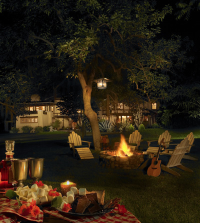 property with a buttressed fountain as a focal point. Wood rafter-tails from